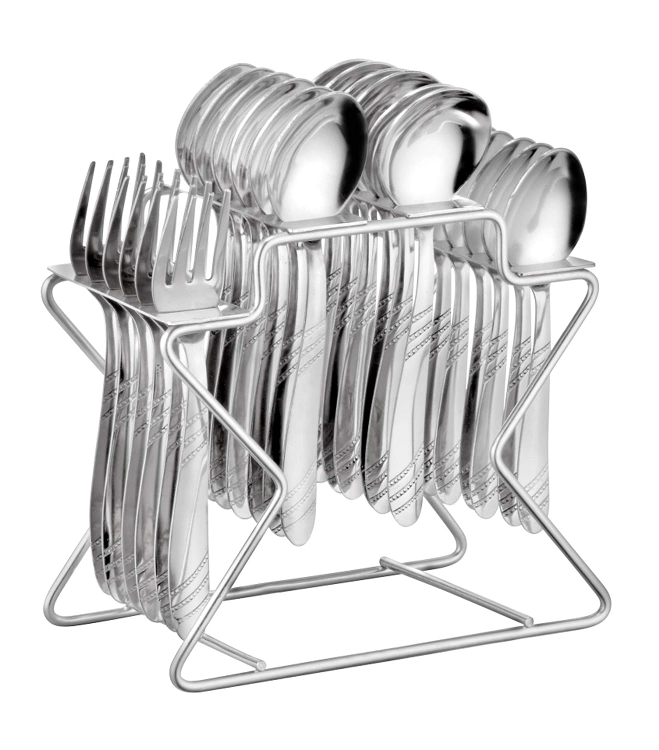 Contains a Master Spoons Set of 6, Table Spoon Set of 6, 6 Fork, 6 Soup Spoons, 1 Stylish Stand, an Elegant Cutlery Set for Dining Table, a Mirror Polished
